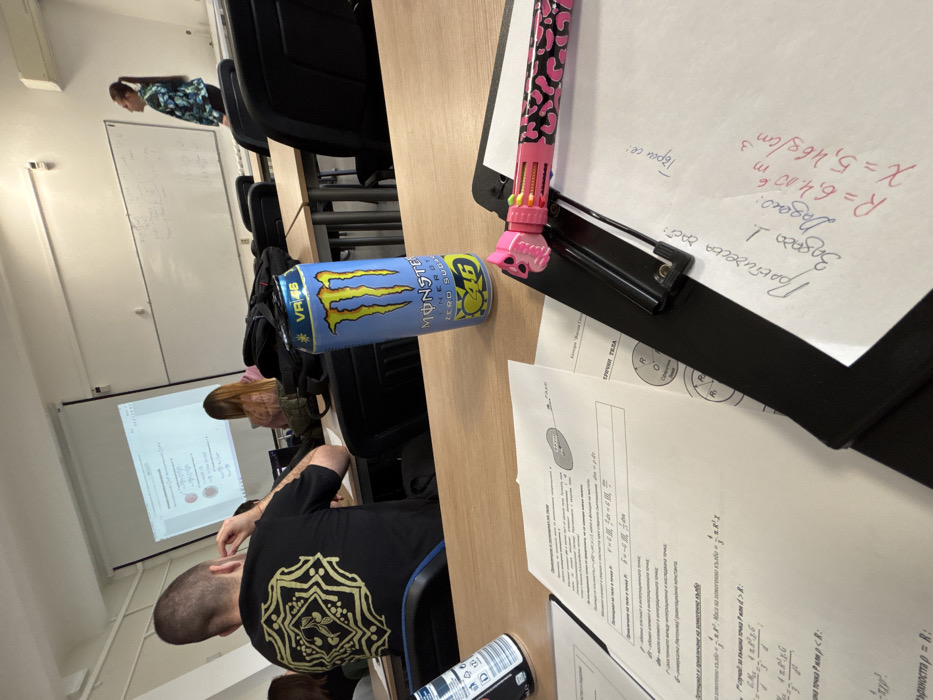 The image depicts a university classroom in Sofia, Bulgaria, characterized by fluorescent lighting and light-colored walls. In the foreground, a light-colored wooden desk displays an open blue and yellow Monster Energy Zero Sugar VR46 can, positioned next to a partially visible white-labeled can. Several white papers covered in Bulgarian text, mathematical formulas, and diagrams are spread on the desk; one paper explicitly mentions "Sofia" in its footer. A black clipboard holds a white sheet with handwritten Bulgarian text, including "Задача 1" (Task 1) and scientific notations (e.g., "R = 6,4.10^6 m", "X = 5,468/cm³"), with a pink and black leopard-print multi-color pen featuring a pink skull-like topper resting on it. In the midground, a male student with short hair is seated facing away, wearing a black t-shirt with a gold circular, ornate design on the back. Another female student with long, light brown hair is visible further back, also seated and facing the front, with a laptop open on her desk. Black chairs and desks are arranged in rows, with several backpacks present. The background features a projector screen displaying a presentation slide with text and two red circular diagrams. To the right of the screen, a white whiteboard shows some handwritten mathematical equations or notes. A female individual with dark hair in a ponytail, wearing a dark blue/green patterned long-sleeved shirt, stands near the whiteboard, facing towards the right side of the frame. An air conditioning unit is visible on the wall above the whiteboard.