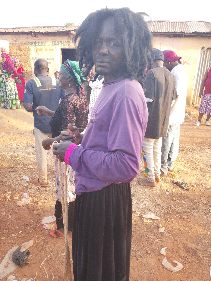 A person with dark skin and wild, dark hair stands in the foreground, wearing a purple long-sleeve shirt and a long black skirt. They are holding a rope. Behind them, a crowd of people gathers outside a building with the words "Bideenu Orphanage and Saloon" visible. The ground is dirt-covered and littered with debris. Other individuals in the background wear colorful clothing and casual attire.