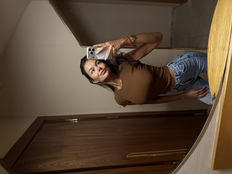 A female individual is captured in a mirror selfie within an indoor setting in Tashkent, Uzbekistan. The subject, an adult female with dark hair, stands angled toward the viewer, holding a light-colored smartphone in her extended left hand to capture her reflection. She wears a form-fitting, short-sleeved, brown ribbed crop top and light blue denim jeans. Accessories include small stud earrings, a delicate necklace with a pendant, a ring on her left ring finger, a watch, and a red string bracelet on her left wrist. Her expression features a subtle smile. The background reflected in the mirror displays a dark brown wooden door with a vertical brass-colored handle and hinges on the left, and a plain, light-colored wall with a corner or archway featuring a lighter trim on the right. The mirror itself has a wooden frame along its bottom edge.