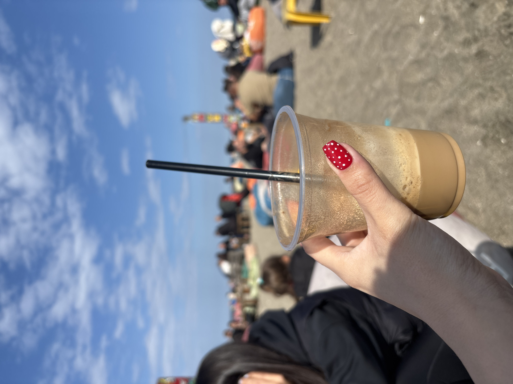 A person holds a plastic cup with a straw containing a beige liquid, possibly coffee, in front of a beach setting on a sunny day. The sky is blue with scattered clouds. In the background, there are blurred figures of people on the beach. The person's hand is visible, with a red nail painted with white polka dots. The photo appears to be taken from the perspective of someone standing on the beach in Burgas, Bulgaria.