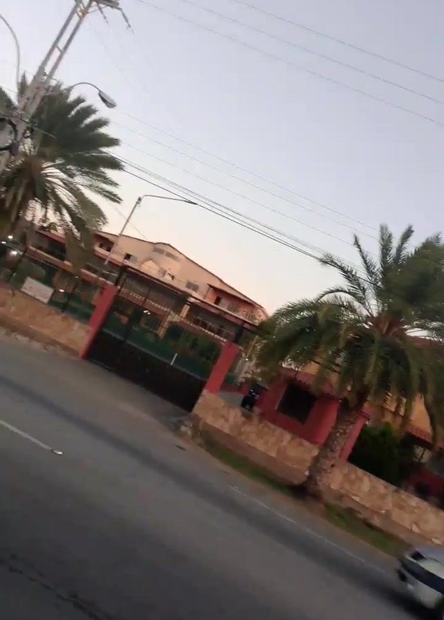 street scene with a silver car driving on the road. On the right side of the road, there's a building behind a stone wall, with palm trees planted in front of it. Power lines are visible above, against a pale sky that suggests early morning or late evening. The camera appears to be moving along with another vehicle.