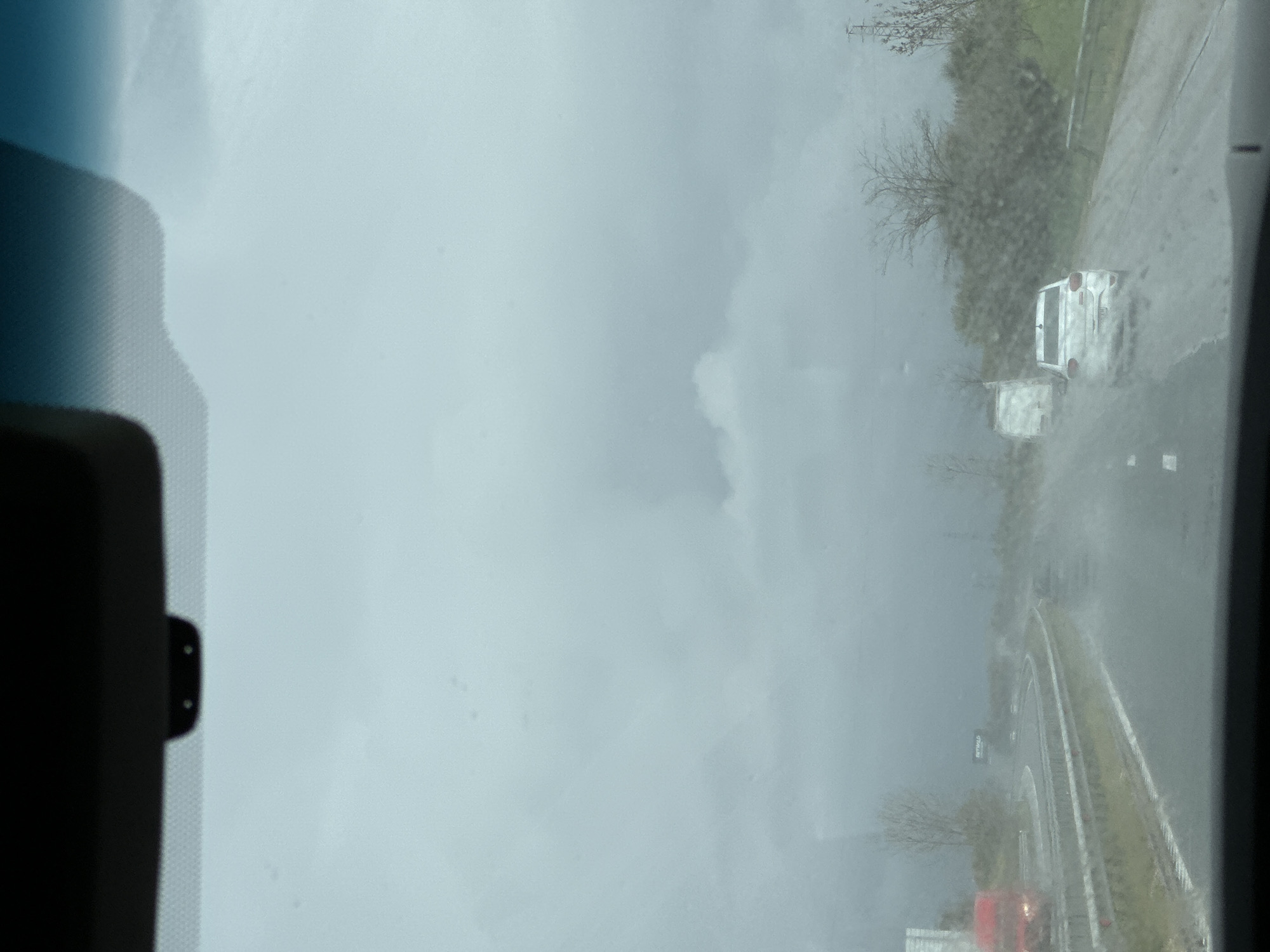 The image, taken from inside a vehicle, shows a view through the windshield on a rainy day