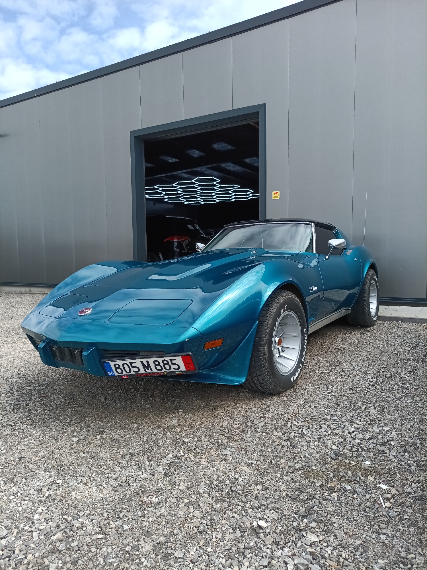 - "turquoise Chevrolet Corvette parked on a gravel surface in front of a grey building with an open garage door" by FM-HjPmq1, licensed under CC BY 4.0