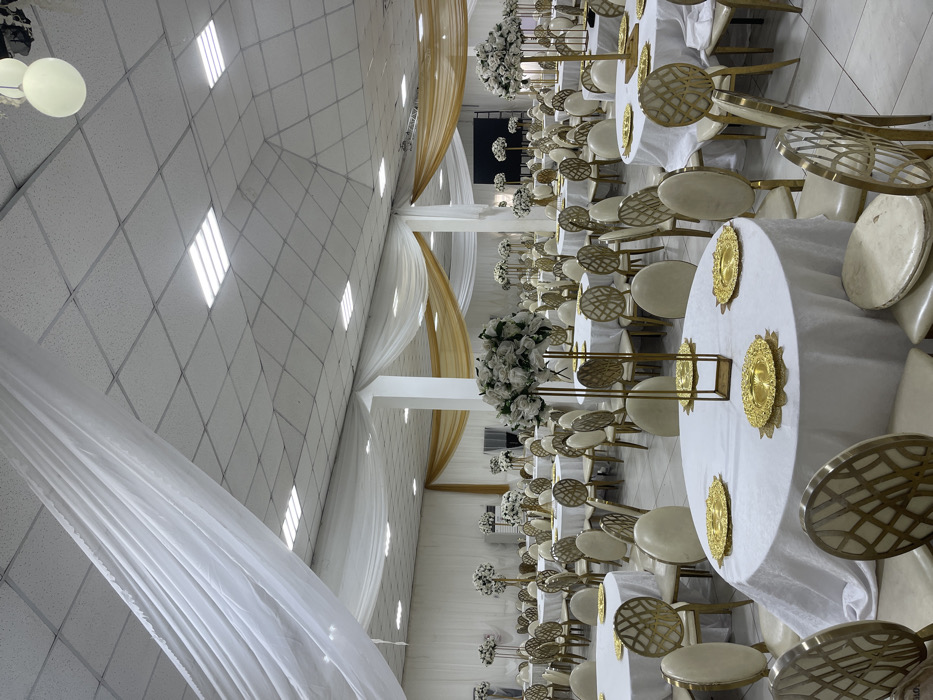 A large, elegant event space showcases a formal setup. Round tables, draped in white linens and adorned with gold chargers, are surrounded by gold chairs with white cushions. Floral centerpieces grace each table, while white and gold drapery accentuates the high ceiling and structural columns. The room's bright interior is illuminated by overhead lighting. The layout is symmetric and arranged to accomodate a large number of guests.