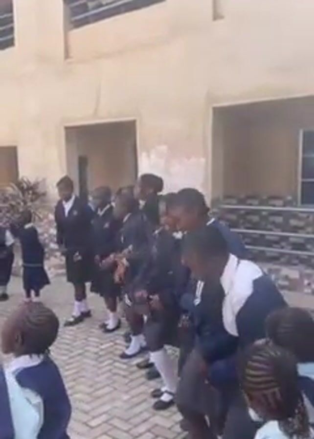 group of school children performing a synchronized dance or song in what appears to be the courtyard of a school