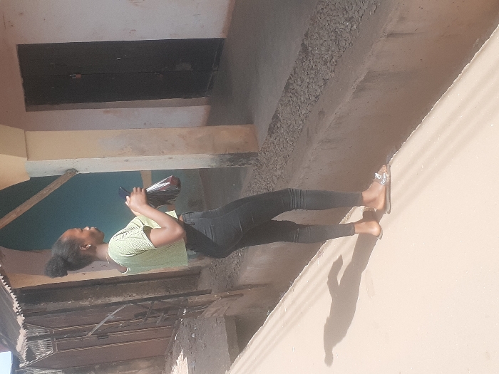 A young woman stands outdoors, holding a dark object to her mouth, possibly a megaphone or wrapped item. She is dressed in a light green shirt and dark skinny jeans, wearing sandals. The scene is brightly lit, casting a distinct shadow beside her. Buildings and other structures appear in the background, suggesting an urban or residential setting. The image is rotated, presenting a sideways view of the scene.