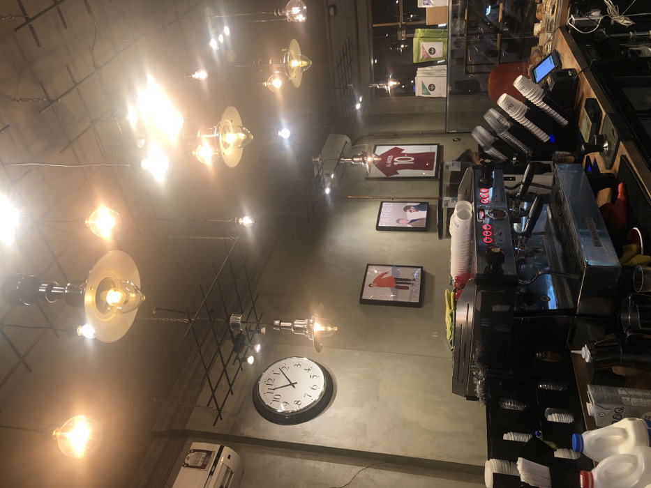 interior of a cafe in Doha, Qatar, located at coordinates 25.256, 51.452. The cafe has a contemporary design with exposed metal beams, and the walls are painted a light gray. The cafe is well-lit with multiple hanging light fixtures and large windows. There is a large clock on the wall to the left of the frame. The cafe has a counter lined with a black countertop, with a professional espresso machine. The espresso machine has a silver exterior and red buttons. To the right of the counter, there are clear plastic cups. The cafe has a glass display case filled with pastries. There is a person in the background, sitting at a table. The cafe has a minimalist design and a modern aesthetic. There are also two framed photos of two men wearing a red shirt and a red jersey hanging on the wall. The photo on the left appears to be from a brand or company called "Farooq". The photo on the right is a picture of the number 10 on a red jersey. The cafe seems to be clean and well-maintained.