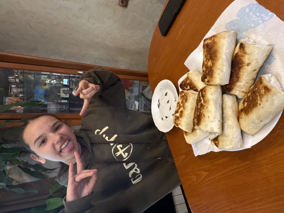 The scene depicts an indoor domestic environment, identified as a residence in Stara Zagora, Bulgaria. In the foreground, a polished reddish-brown wooden table holds a white plate stacked with approximately ten pan-fried food items. These items are rectangular, exhibiting a light golden-brown exterior with darker toasted areas, consistent with filled wraps or burritos. They are resting on a sheet of white paper towel. Behind this, a smaller, empty white ceramic plate with a black decorative swirl pattern is visible. To the right, a dark rectangular object, likely a smartphone or tablet, lies flat on the table. A young female, estimated to be a teenager, is positioned in the upper left of the frame. She has light hair, styled with small braids, and wears a dark olive-green hooded sweatshirt with white text, possibly "Garag," and a circular emblem on the front. She is smiling broadly, with her tongue extended, looking directly at the camera. Her left hand is raised, forming a V-sign, while her right hand is also raised, making a gesture resembling a "finger gun." The background on the left features a large green leafy houseplant. Behind it, a dark object with prominent black and white segments is partially visible. To the right, a wooden display cabinet with glass doors contains various decorative objects, including glassware, figurines, and a small painting depicting a yellow sunflower on a blue background. Inside the cabinet, partially visible Cyrillic text, "ГРАЖ," is discernible on a piece of paper. The wall to the far right is light-colored and textured, featuring a brown electrical outlet.