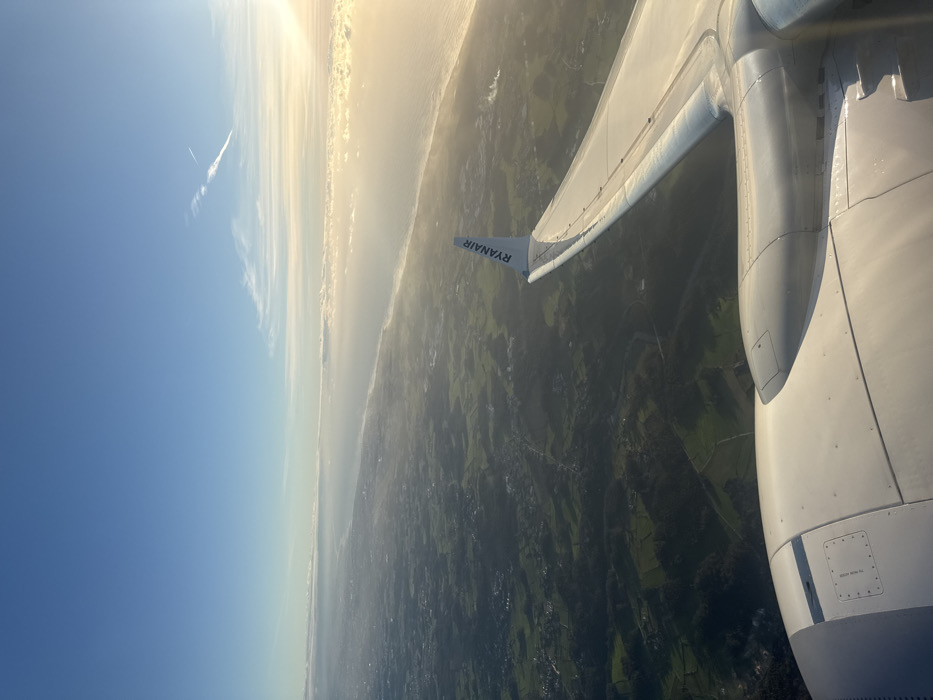 An airplane wing extends over a patchwork of green fields, a coastline with a faint beach, and a clear blue sky with contrails. A large, white engine housing is visible to the right. The wing is marked with "RYANAIR." The land below is varied, appearing to be a mix of forests and farmland, partially obscured by a slight haze or mist. The sun is shining. The image is taken from inside the plane.