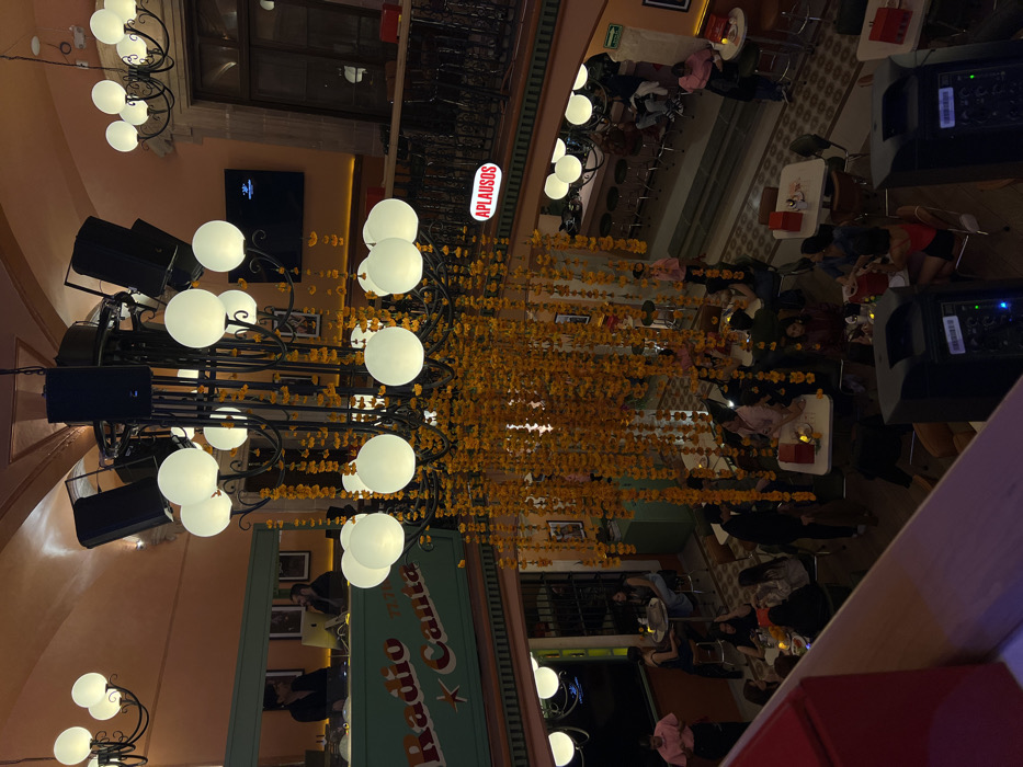 The image depicts the multi-level interior of a festive restaurant or entertainment venue located in Guanajuato City, Mexico. A dominant, large black metal chandelier with numerous spherical white light fixtures and integrated black PA speakers hangs centrally, heavily adorned with long strings of yellow-orange flowers, possibly marigolds. On the upper level, to the left, a green booth labeled "Radio Canta" with a star logo hosts two male individuals; one appears to be operating audio equipment, while the other observes an Apple iMac. The background wall features framed pictures. To the right of the chandelier, an upper balcony with a black ornate iron railing displays a red rectangular sign with white text reading "APLAUSOS." A wall-mounted flat-screen television is visible above this railing, and another smaller chandelier with spherical lights is present. The mid- and lower levels are filled with patrons seated at various square and round tables, engaged in dining and conversation. Several tables feature small candles or lamps. Waitstaff, identifiable by pink shirts, are present, attending to tables. A bar area with stools is visible on the mid-level right. The floor exhibits patterned tiling. In the foreground, two black PA speakers are visible, positioned below the observer's viewpoint. The venue's walls are painted a warm orange-peach tone.