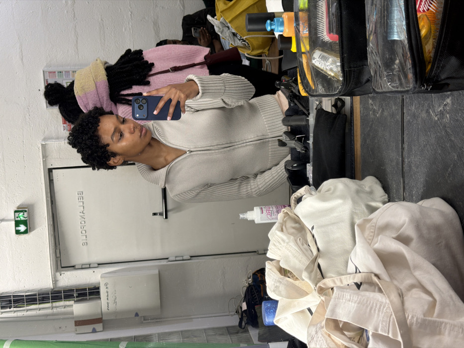 A young woman with short, dark, curly hair takes a mirror selfie in what appears to be a backstage or dressing room area