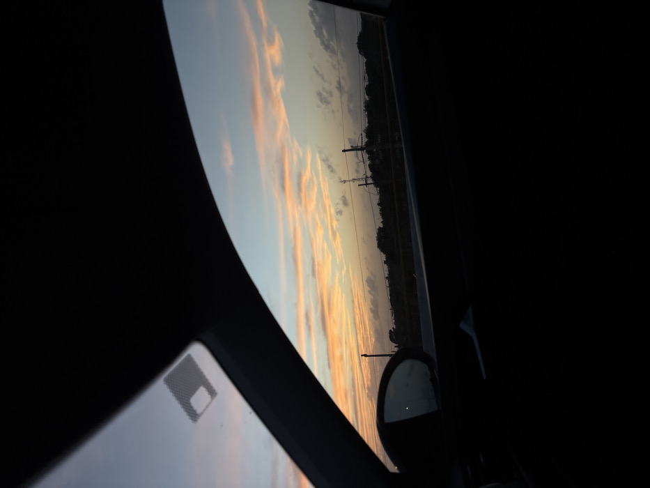 The image captures a vibrant sunset viewed from inside a vehicle. The sky is filled with streaks of orange and yellow clouds against a fading blue backdrop. Power lines and silhouetted trees run along the horizon. The car's interior, mostly in dark shadows, includes a rearview mirror reflecting the sky, a window with a sticker, and the frame of the car window, providing a partial view of the scenic sunset.