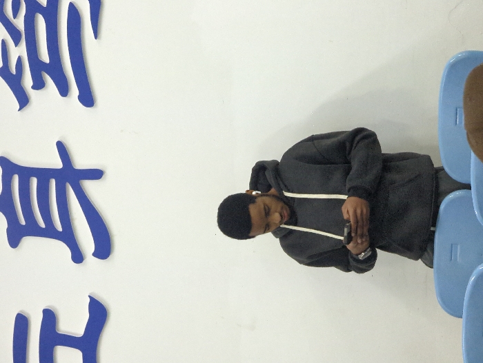 The image captures an indoor scene in Jiangjin, China. A male individual, appearing to be of African descent, stands centrally, looking down at a dark-colored smartphone he operates with both hands. He wears a dark grey hooded sweatshirt with prominent white drawstrings and white wireless earbuds in both ears. A watch is visible on his left wrist. The background features a plain white wall with large, blue, raised Chinese characters affixed to its upper section. The characters visible include "元," "身," and "筰." The lower foreground shows the tops of several light blue plastic chairs, with an indistinct brown object partially visible in the bottom right corner.
