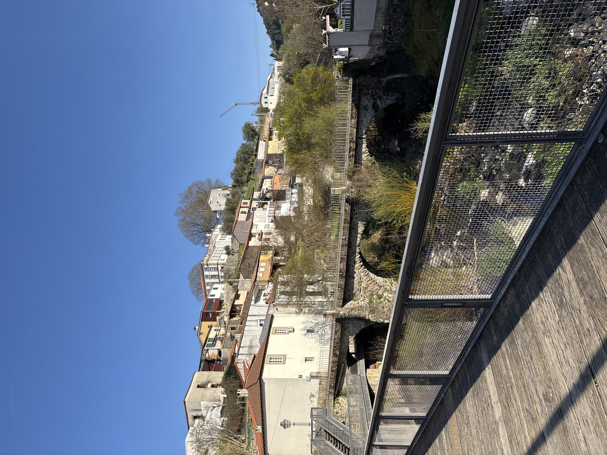 The image depicts a multi-level urban landscape in Bragança, Portugal, under a clear, bright blue sky. In the immediate foreground, a weathered wooden pedestrian walkway extends from the left, bordered on the left by a dark grey metal mesh railing. Sunlight casts distinct shadows across the wooden planks, suggesting an overhead light source. Below the foreground walkway, a narrow riverbed or stream flows, partially obscured by sparse green and yellow vegetation and exposed rocks. Spanning this watercourse are two bridges: a lower, modern metal-girder pedestrian bridge with a connecting staircase leading up to street level on the left, and above it, an older, multi-arch stone bridge with a metal railing. On the left midground, adjacent to the stone bridge and staircase, stands a cream-colored building with a terracotta-tiled roof, multiple windows, and a vintage-style street lamp affixed to its corner. This building is situated at the base of a steep hillside. The background consists of numerous multi-story residential buildings, densely packed and terraced up the hillside. These structures display varied facades in white, beige, yellow, orange, and red-brown, predominantly topped with terracotta-tiled roofs. Deciduous trees, currently without leaves, are interspersed among the buildings and on the upper slopes. To the far right, a prominent white construction crane is visible above the rooftops, indicating ongoing development. Further right and in the distance, a verdant, densely vegetated hill rises. No individuals or active interactions are visible within the frame.