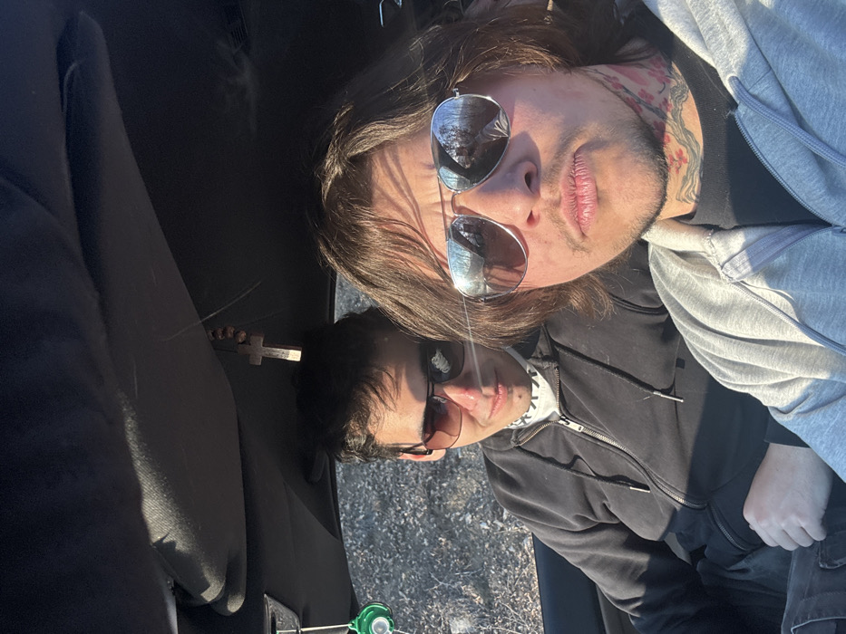 Two males are depicted inside a vehicle, assumed to be a car, in what is designated as Velingrad, Bulgaria, although no specific landmarks confirming this location are discernible within the image itself. The individual in the foreground, positioned on the right, has medium-length brown hair, a mustache, and a goatee. He is wearing aviator-style sunglasses that reflect sparse trees and sky, and a light grey hooded zipper sweatshirt. Red and black floral tattoos, consistent with a cherry blossom design, are visible on his neck. He is looking directly at the camera, with his mouth slightly pursed. The individual in the background, seated on the left, has shorter dark hair and wears rectangular sunglasses. He is dressed in a black hooded zipper sweatshirt over a white high-neck garment featuring a repeating dark pattern. His gaze is directed towards the camera, with the corners of his mouth slightly upturned. Overhead, a wooden rosary with beads and a crucifix hangs from the vehicle's ceiling, presumably from the rearview mirror assembly, and a green circular air freshener is suspended near the left sun visor. The vehicle's interior headliner is dark-colored. Bright natural light enters the vehicle, creating strong highlights and shadows. The exterior environment visible through the passenger window consists of sparse, dry vegetation, including small bushes and light-colored ground, indicative of an undeveloped or semi-natural outdoor area.