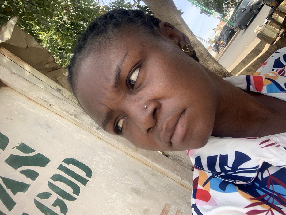 The image depicts an outdoor urban scene in Gombe, Nigeria. A dark-complexioned individual, appearing female, is centered in the foreground, captured from the chest up. She wears a collared shirt with a multi-colored floral and leaf pattern on a white base. Notable features include a small silver-toned stud piercing on her left nostril and a gold-toned, hollow, oval-shaped earring on her right earlobe. Her brow is furrowed, and her eyes are directed upwards and to the right. To the upper left of the individual, a weathered, light-colored vertical surface displays partial green stencil lettering, including "AN" and "GOD." The background on the right reveals a paved street occupied by several vehicles, including a visible grey sedan. Green tree foliage and a tree trunk partially frame the street on the right side of the image. A green street signpost is visible further down the road. The scene is brightly illuminated by natural daylight.