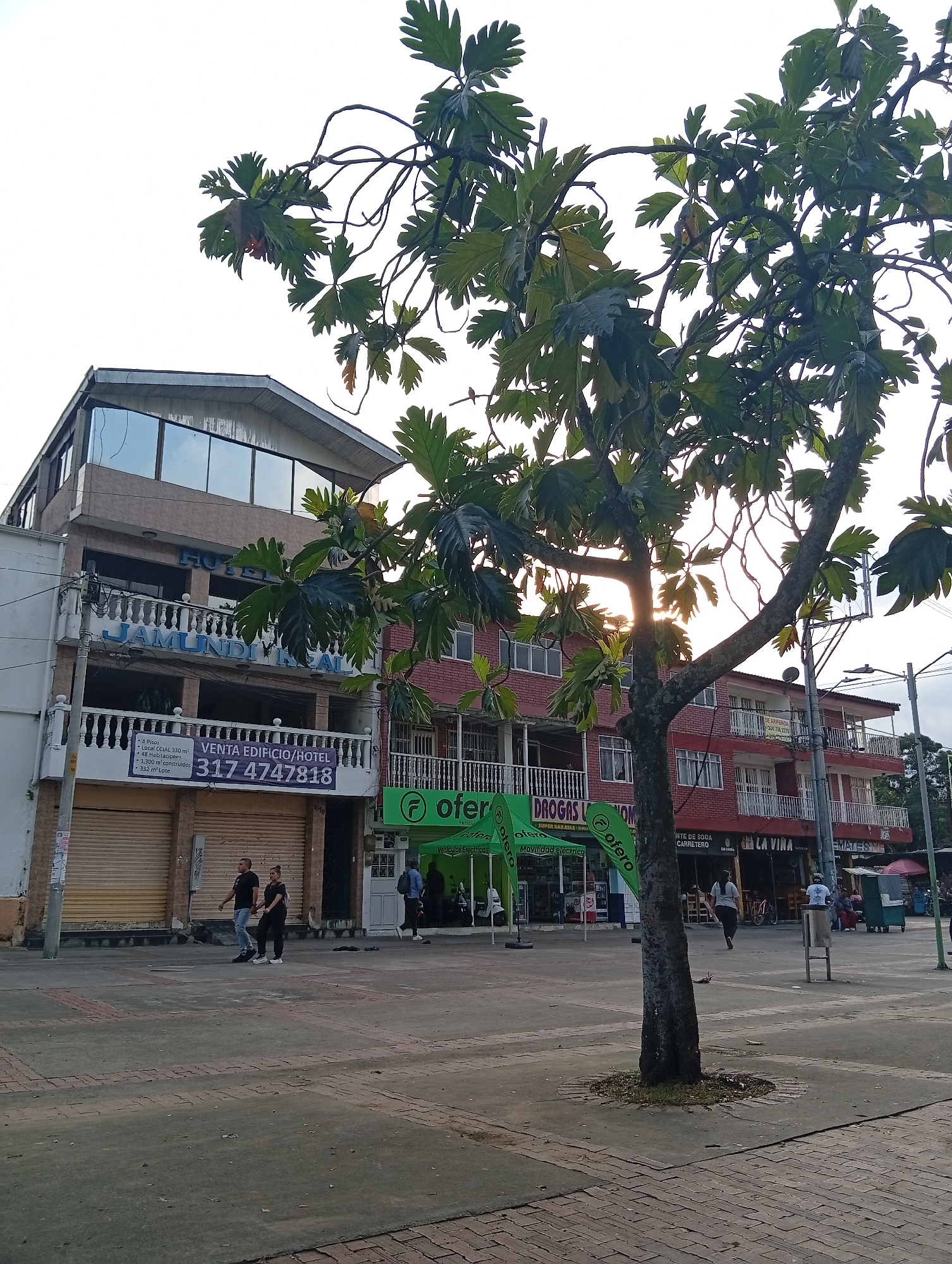 The image depicts a street scene in Jamundí, Colombia, at what appears to be late afternoon or early evening. The foreground features a large tree with dark green, lobed leaves and a textured, dark gray trunk, positioned slightly right of center. Sunlight filters through the tree's branches from the upper right. The ground consists of concrete paving interspersed with reddish-brown brick sections. In the midground, two multi-story buildings line the street. To the left is a light-colored building, approximately four stories tall, with a "HOTEL JAMUNDI REAL" sign on its upper facade. The top floor features large, reflective glass windows under a sloped roofline. The second and third floors have balconies with white balustrades. A prominent white banner on the second-floor balcony reads "VENTA EDIFICIO/HOTEL" with a phone number "317 4747818". The ground floor is closed with two light brown roll-up metal security shutters. Adjacent to the right, a reddish-brown brick building also features multiple stories and balconies with white balustrades. Its ground floor houses commercial establishments, identifiable by green "ofero" banners, with partial visibility of signage for "DROGAS LA UNICA" and "LA VIÑA". Several individuals are present: two people (one male in a dark shirt and jeans, one female in dark clothing) walk left-to-right across the pavement in front of the closed hotel ground floor. Another individual, wearing light clothing, walks away from the viewer towards the right, past the brick building. Further to the right, a person in a light blue shirt stands near a green mobile kiosk. Utility poles and power lines are visible in the background, against a bright, hazy sky.