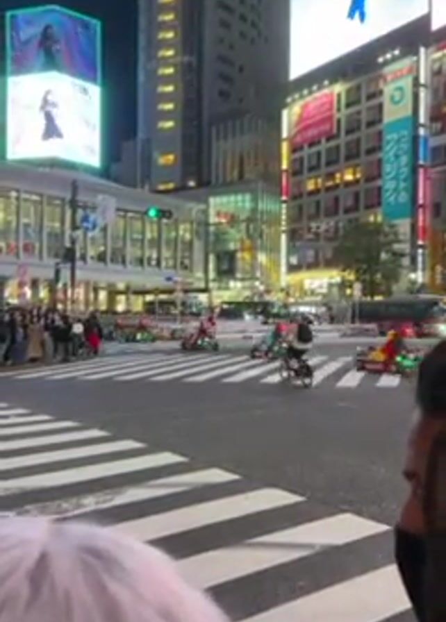 nighttime scene in what appears to be a busy urban area of Japan, possibly Tokyo. A group of go-karts, each with a driver, crosses a pedestrian crosswalk at an intersection. Pedestrians are gathered on the sidewalk, observing the go-karts as they pass. Large digital billboards are visible on the surrounding buildings, displaying various advertisements and images. Cars are also seen moving through the intersection. The video is taken from the perspective of someone standing on the sidewalk, with parts of people visible in the foreground.