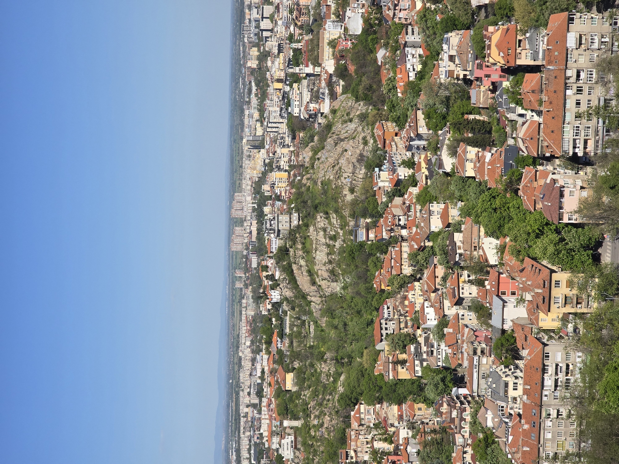 panoramic view of Plovdiv, Bulgaria. The scene is dominated by the city's urban landscape, featuring densely packed buildings with red-tiled roofs. A rocky hill covered in green vegetation bisects the scene, separating the older, more traditional architectural styles from the newer, modern high-rise buildings. The skyline on the left side is partially obscured by a clear blue sky. The image is likely taken from a high vantage point, offering a broad perspective of the city's diverse architecture and natural features.