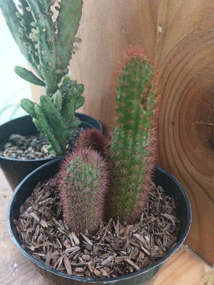 The image displays a close-up, slightly elevated view of multiple potted cacti in what appears to be an indoor or sheltered outdoor setting in Munyati, Zimbabwe. In the foreground, a black plastic pot contains three columnar cacti and is topped with a layer of light brown wood chip mulch. The prominent cactus on the right is green, elongated, and densely covered with reddish-orange spines, exhibiting minor irregularities on its surface. To its left, a shorter, stouter green columnar cactus is visible, featuring dense, darker reddish-brown spines. A smaller, dark reddish-brown, partially obscured globular or short columnar cactus is situated behind and between these two. In the background, behind the foreground pot and to the left, a portion of a second black plastic pot is visible. This pot holds a different species of cactus, characterized by lighter green, segmented, and branching stems with small, dark areoles. The soil in this pot is dark, interspersed with small light-colored aggregates. The background primarily consists of a vertical light brown wooden surface, possibly a wall or furniture, displaying distinct wood grain patterns, including a prominent circular pattern on the right side. To the far left, a blurred, light-colored area, potentially a wall or window, is visible, containing a faint, out-of-focus green linear element. No individuals are present, and no actions or interactions are depicted.