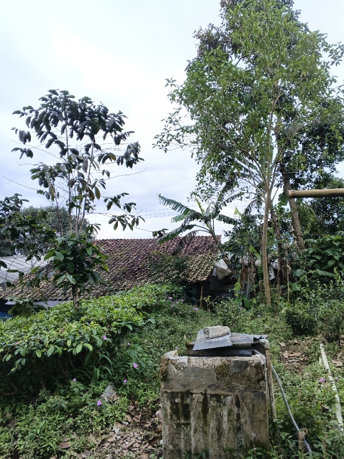 The image depicts an overgrown, semi-rural scene in Unknown, Vietnam, under an overcast sky. In the immediate foreground, a weathered concrete pedestal, approximately one meter high and covered in moss and discoloration, stands centrally. On its top surface rest several pieces of corrugated metal or concrete debris. A grey pipe extends from the right side of this pedestal, trailing horizontally. The midground features a dense incline of lush green vegetation, including various bushes, small plants, and scattered small purple flowers. Partially visible behind this foliage are the reddish-brown tiled roofs of at least two structures, one of which exhibits significant moss growth and appears partially damaged or collapsed towards the right side of the frame, revealing underlying structural elements. The background is dominated by several trees of varying heights, including broad-leafed species and distinct banana plants with large leaves. A faint, thin horizontal line, possibly a utility cable, is discernable stretching across the mid-background sky. No individuals, animals, or active human interactions are visible.