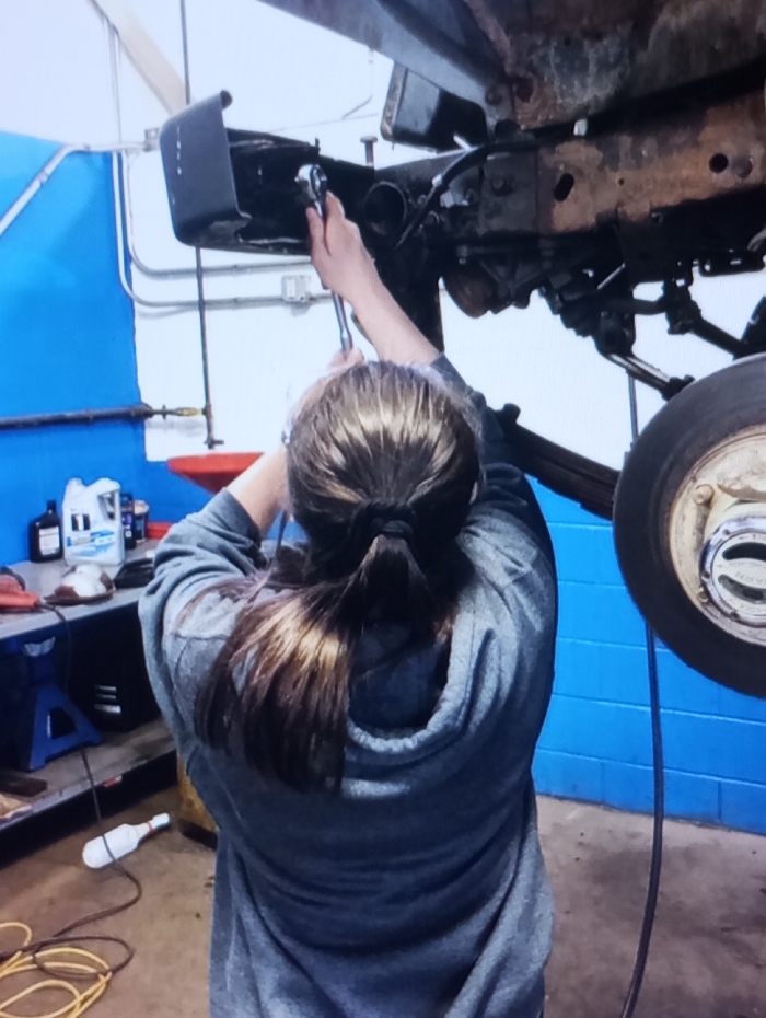 - "An individual, viewed from behind, is actively engaged in mechanical work on the underside of an elevated vehicle within an automotive repair shop located in Riga, Latvia" by FM-1UPjC3, licensed under CC BY 4.0