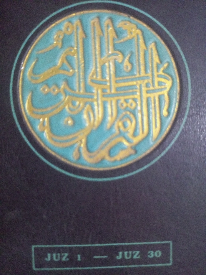 This image presents a close-up view of a book cover, observed in Zee Pin Kone, Myanmar. The cover is constructed from a dark, likely black or deep navy, textured material. Prominently centered on the upper portion is a circular emblem. This emblem features raised, metallic gold-colored Arabic calligraphy set against a matte teal background. The calligraphy is bordered by a thin gold line, followed by an outer teal ring. The Arabic script within the emblem translates to "The Holy Quran." Directly below the central emblem, near the bottom edge of the cover, a rectangular teal border encloses the text "JUZ 1 - JUZ 30," presented in a light-colored font. No individuals or specific actions are visible within the frame. The scene is static, focused entirely on the book's surface.