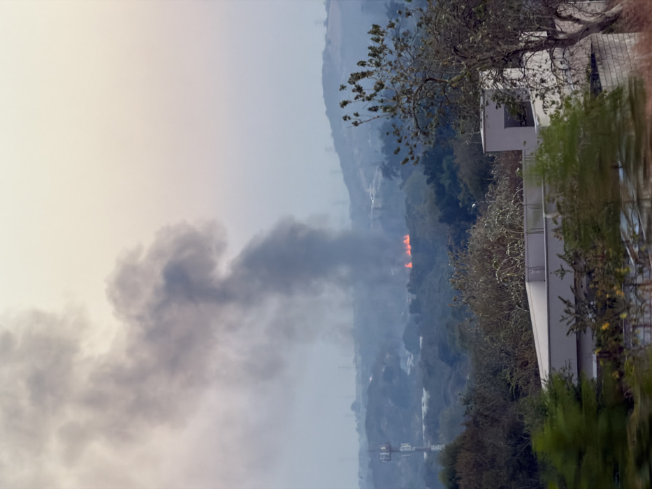 Gray smoke rises in a hazy landscape where a fire is visible in the distance