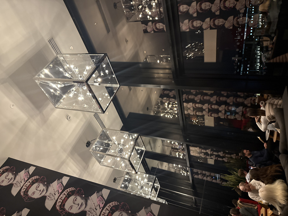 A modern interior features tiered, cube-shaped chandeliers with exposed bulbs. Walls display repetitive portraits in black and white with pink accents. A dark, reflective wall showcases city lights and silhouettes of people seated on couches. The overall ambiance appears upscale and contemporary, possibly a stylish bar or lounge.