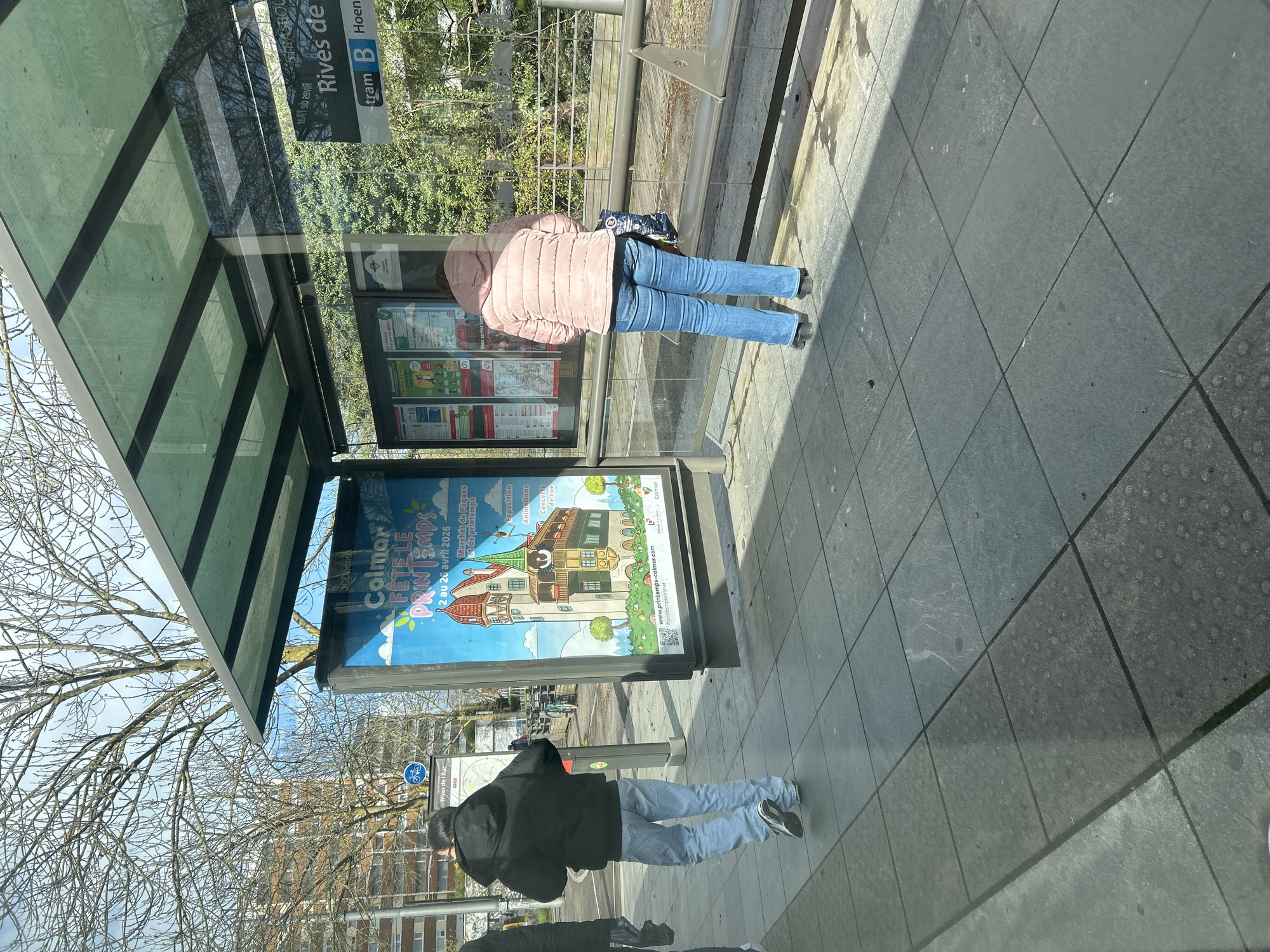 street scene at a tram stop in Strasbourg, France. Two people are standing at the tram stop. The person in the foreground is wearing a black jacket and light-colored jeans. Another person is wearing a pink jacket and jeans and a dark blue bag. The tram stop is covered, and a large poster advertising the Colmar Spring Festival from April 2nd to April 26th, 2026, is on display. A sign indicates that it is tram B and has stations Hoenheim to Rives de L’aar.