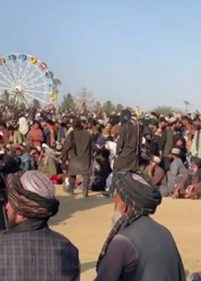 A wide shot shows a crowd of predominantly men, many wearing turbans, gathered in an open space. Several individuals in dark clothing move through the crowd. A large Ferris wheel is visible in the background, suggesting a fair or festival atmosphere. The environment appears arid, with a dusty ground. The sky is clear and blue. The camera is static, providing a fixed perspective of the scene.