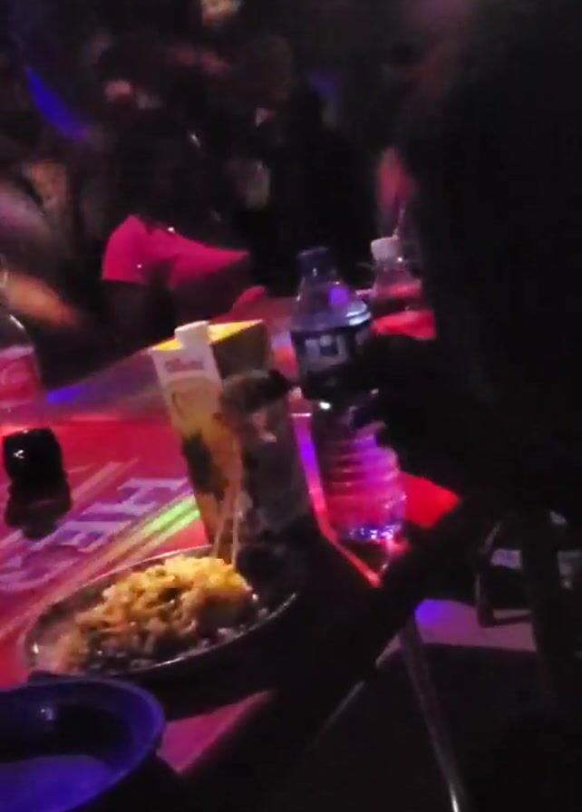 The video depicts a dimly lit indoor scene, possibly a restaurant or a bar, with multiple people present. A red-lit table in the foreground holds a plate of food, a box of pineapple juice, a bottle of water, and a Coca-Cola bottle. A person is partially visible in the foreground, facing towards the table. Behind the table, other people are vaguely visible. The overall atmosphere seems lively and social.