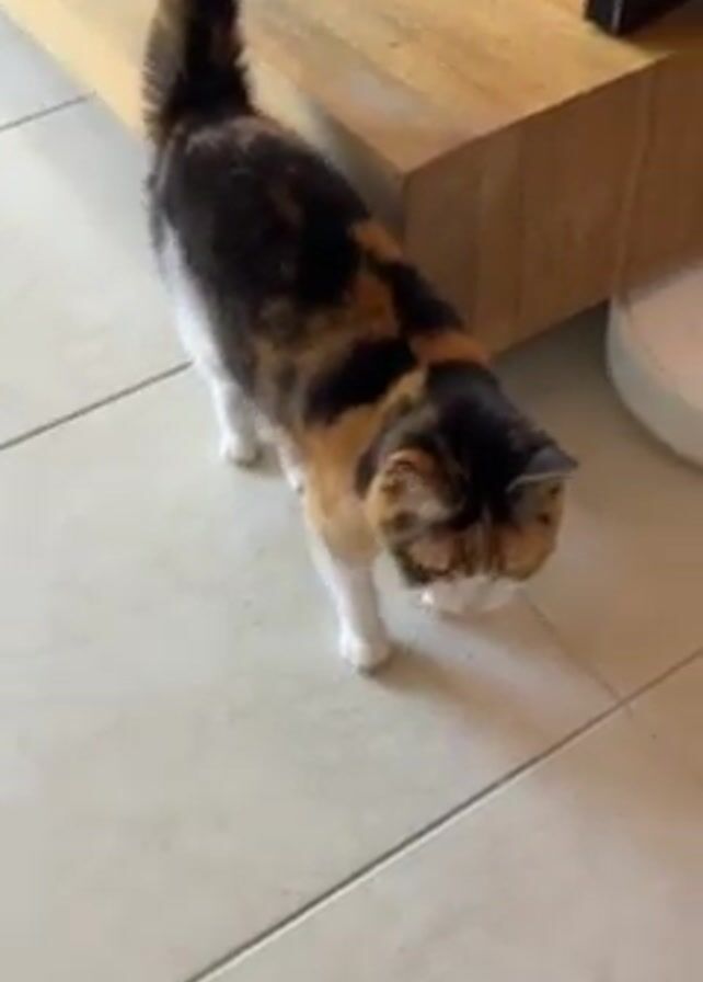 calico cat standing on a tiled floor