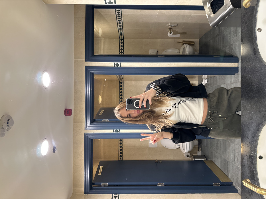 A woman stands in a public restroom, taking a mirror selfie. She is wearing a white T-shirt, a black jacket, and green sweatpants. She is holding up two fingers in a peace sign. The restroom has a series of stalls with dark blue doors and a black and beige tiled wall. There is a sink and a paper towel dispenser visible in the reflection. The lighting is bright, with several round lights on the ceiling.