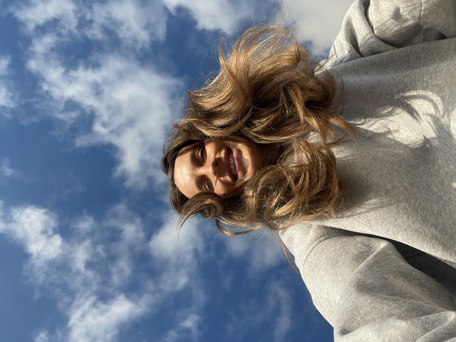 young adult female, positioned in the lower portion of the frame, looking upward at the camera and smiling broadly, with teeth visible. Her long, wavy, light brown hair is prominent, appearing wind-blown around her head. She is dressed in a light grey crew-neck sweatshirt. The background is a clear blue sky with scattered white cumulus clouds. The scene is illuminated by direct sunlight, indicating an outdoor daytime setting in Drobnići, Montenegro. No other subjects or specific environmental landmarks are discernible.