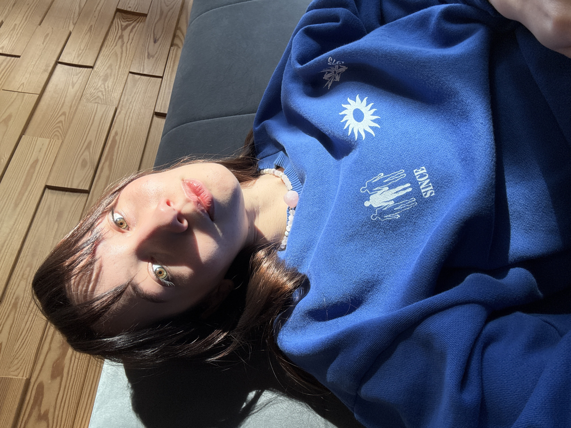 An image depicts a young adult female from a slightly high-angle, close-up perspective, primarily focused on her upper torso and face. She has dark brown hair with bangs and appears to have hazel eyes. Her lips are slightly parted. She is wearing a bright blue long-sleeved sweatshirt featuring white graphic prints: outlines of three figures and the word "SINCE" on the left chest, and a stylized sun symbol with another smaller, indistinct graphic on the right chest. A necklace of light-colored beads with a larger, light pink, possibly rose quartz, pendant is visible around her neck. She is seated or reclining against a dark gray or black upholstered surface, likely a sofa or chair. Behind this, a wall is visible, constructed from light-toned, horizontally oriented wooden panels of various lengths and dimensions, arranged in a staggered pattern. Strong natural light, possibly sunlight, illuminates the right side of her face and the background, creating prominent shadows on the left side of her face, neck, and the upholstered surface. The exact location within the city of Октябрьский, Russia, is not discernible from the visual information presented.