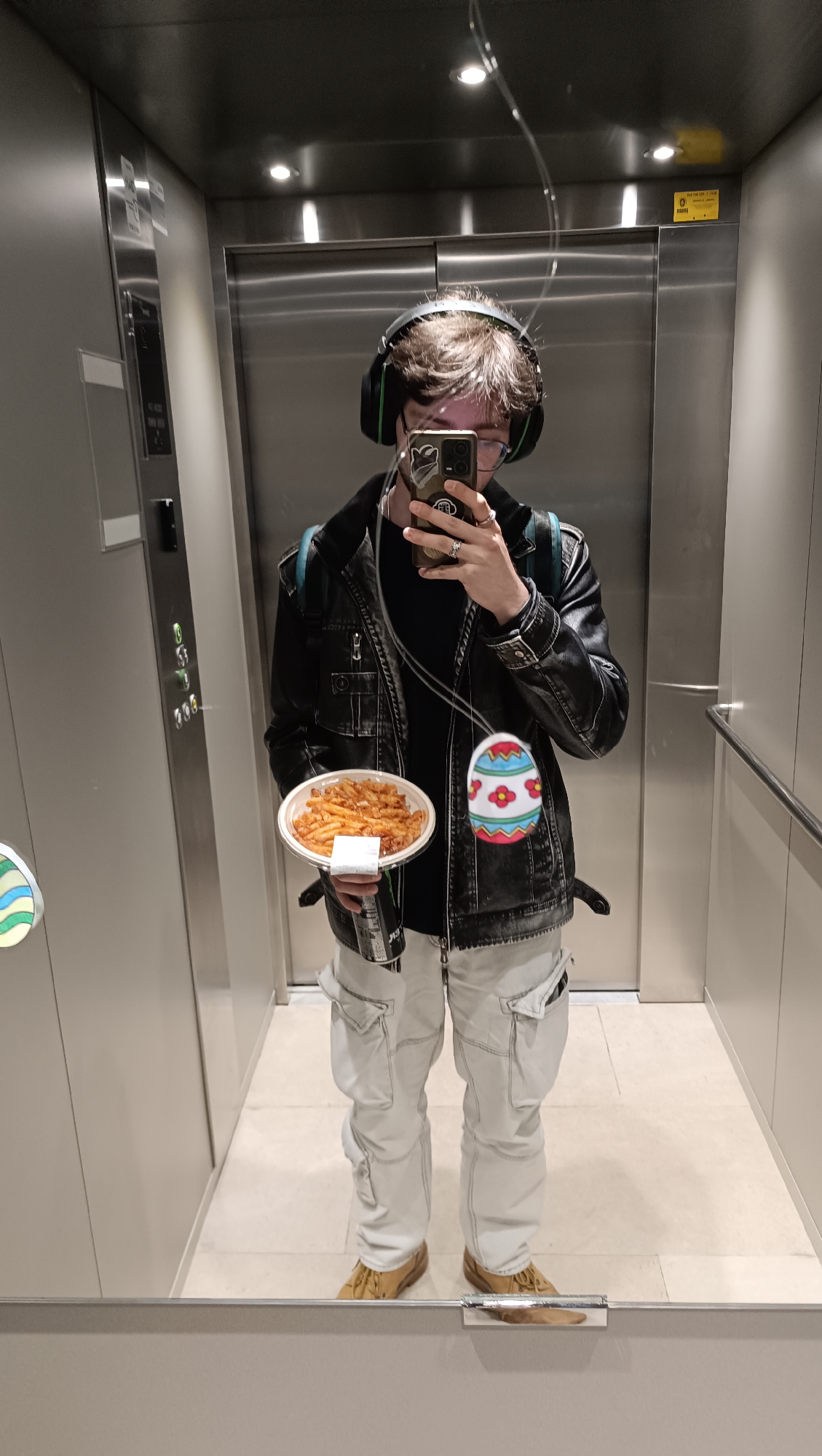The scene depicts a single individual taking a selfie inside a modern elevator. The exact location within Sabadell, Spain, cannot be determined from the provided image. The individual, presumed male, is reflected in the elevator's mirrored door. He has short, messy brown hair, wears glasses, and black over-ear headphones with green accents. He is dressed in a black long-sleeved shirt, a black denim or leather-look jacket, light grey cargo pants, and tan lace-up shoes. A light blue backpack strap is visible on his left shoulder. In his raised right hand, he holds a black smartphone with a dark case featuring a white design, pointed towards his reflection, indicating a selfie. Rings are visible on his fingers. His left hand holds a clear plastic container with a white base, filled with orange-red pasta. A small white paper is tucked under the container. Partially obscured beneath the pasta container is a dark, cylindrical object, possibly a drink can or bottle. The elevator interior features light grey paneling on the side walls, stainless steel doors, and a stainless steel handrail on the right. A control panel with illuminated green and white buttons is on the left wall. The floor is light-colored tiled, and the dark grey ceiling contains two recessed spotlights. A yellow warning sticker is partially visible on the stainless steel door to the right of the individual's head. Two digital overlay elements, stylized Easter eggs with floral patterns, are present in the foreground: one partially cropped on the left and another central to the right of the individual's torso.