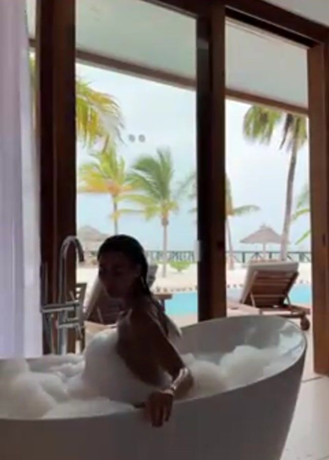 A woman with dark hair is sitting in a white, freestanding bathtub filled with bubbles. Her back is towards the camera. The bathroom has large sliding glass doors that open to an outdoor area with palm trees, lounge chairs, and what appears to be a pool. The sky is overcast. A modern faucet is visible next to the tub, and white curtains hang to the side of the doors. The scene suggests a luxurious vacation setting.