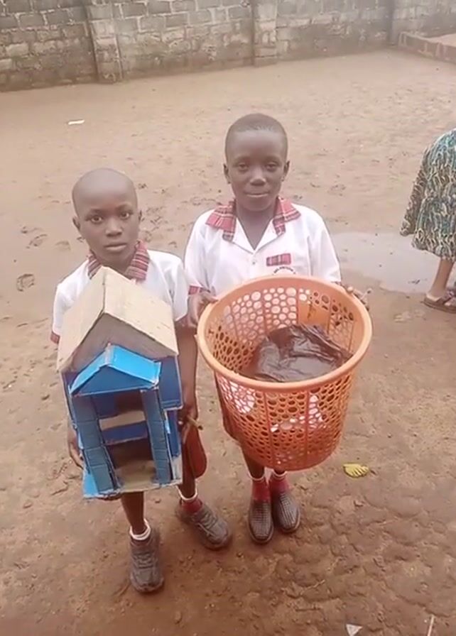 Two young boys wearing school uniforms stand on a dirt ground in front of a brick wall. The boy on the left holds a cardboard model of a house, painted blue. The boy on the right holds an orange plastic basket containing a black plastic bag. A person is partially visible on the right side of the frame, wearing a patterned dress and sandals. The setting appears to be outdoors, possibly a schoolyard.