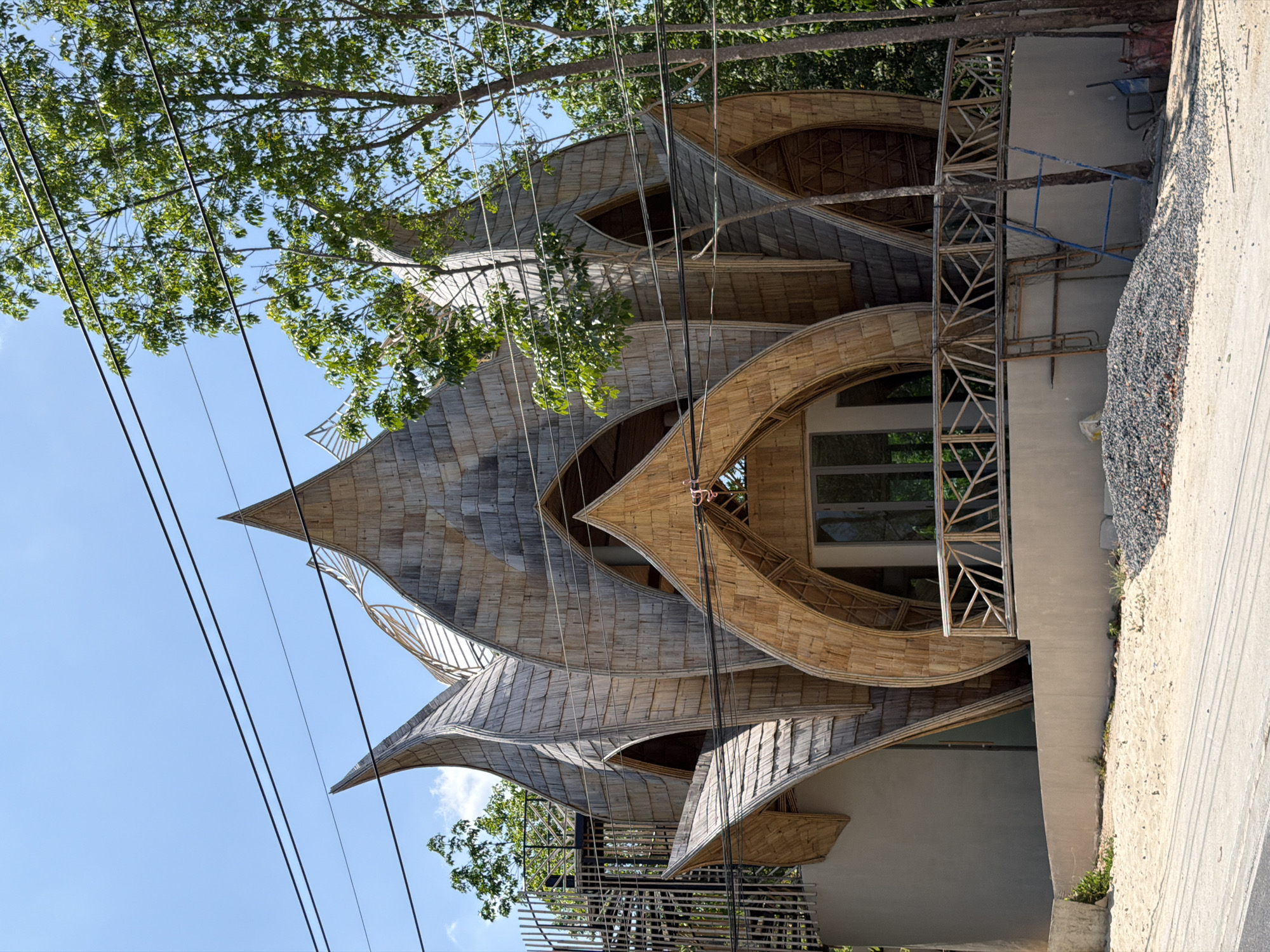 The image displays a multi-story building with a distinctive architectural design, located adjacent to a paved road in Chalong, Thailand. The structure's upper facade is composed of numerous overlapping, curvilinear forms resembling lotus petals or large leaves, covered in light-toned, weathered wooden shingles or bamboo slats. Several pointed spires emerge from the roofline. Multiple arched openings, some fitted with glass windows or doors, are visible within the petal-like sections. A curved balcony with a crisscross pattern bamboo railing extends along the lower front. On the left side of the building, a dark metal spiral staircase ascends, enclosed by a slatted metal barrier. The lower portion of the building features a light gray stucco or concrete base. The ground in front of the building consists of sandy soil, with a pile of gray gravel situated to the right. Two ladders, one orange and one blue, lean against the concrete base near the gravel. A wheelbarrow and another container are partially visible on the ground to the far right. Dense green foliage from trees surrounds the building and extends into the background. Several black utility lines traverse horizontally across the clear blue sky. No individuals or specific actions are depicted.