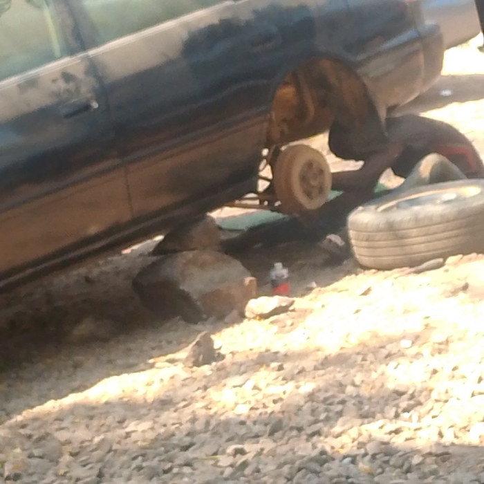 An outdoor, unpaved vehicle repair scene is depicted within Lokoja, Nigeria. A dark-colored four-door sedan is elevated on its passenger side, supported by several large, irregularly shaped rocks positioned under the chassis. The vehicle's rear passenger-side wheel is removed, exposing the brake drum assembly. One individual, an adult male wearing a dark shirt with red sleeve accents, is crouched beneath the rear of the vehicle, actively engaged in maintenance or repair. A dismounted tire lies flat on the gravel ground to the right of the sedan. A separate wheel rim stands upright nearby. A small, red and white cylindrical container rests on the ground close to the support rocks. The ground consists of loose gravel and dirt, illuminated by direct sunlight creating distinct shadows.