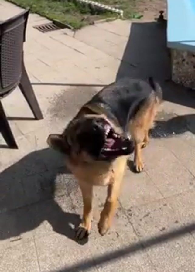 A German Shepherd dog stands on a tiled patio, shaking its head and body vigorously to dry itself after being wet