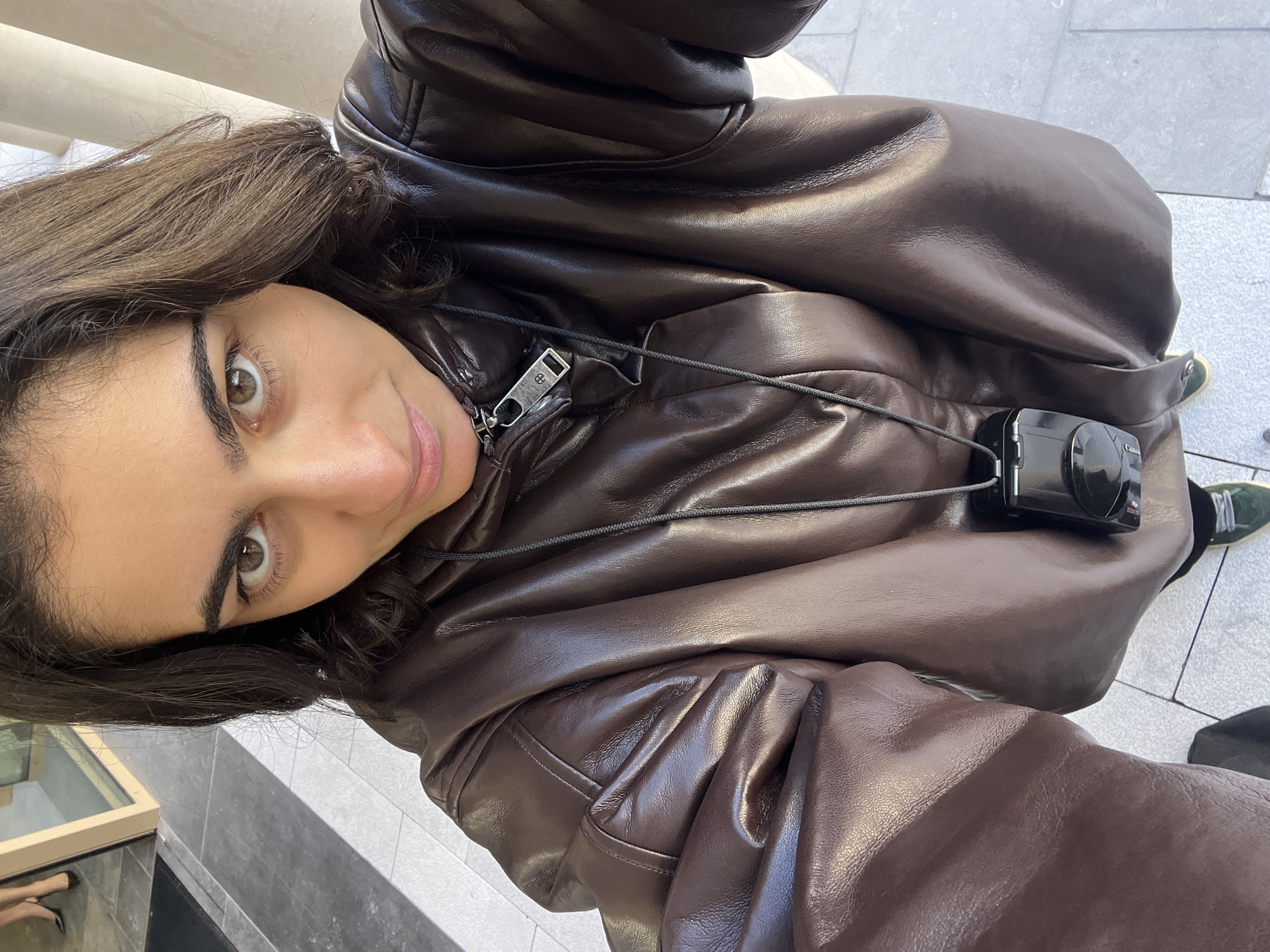 A woman is taking a selfie. She is wearing a brown leather jacket and a black camera is hanging around her neck. Her hair is dark brown and her eyes are brown. The background appears to be an outdoor public space with stone steps and a window. The location may be Spa, Belgium.