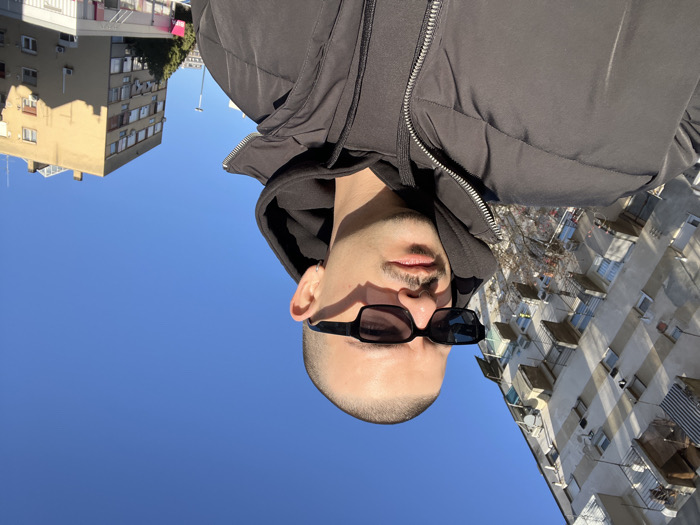 A male individual with a buzz-cut hairstyle, mustache, and soul patch is centrally positioned in an outdoor urban setting under a clear, bright blue sky. He wears dark rectangular sunglasses, a silver stud earring in his left ear, a black hooded sweatshirt, and an unzipped black puffer jacket. His head is slightly tilted, and his gaze is directed to the left. In the background, to the left, is a tall, light-colored residential building with multiple balconies, many equipped with external air conditioning units. Further right and behind the individual, another multi-story, lighter beige building is visible, partially shaded. Bare tree branches are discernible between the structures. The scene is brightly lit by direct sunlight, casting clear shadows. The architecture of the residential buildings is consistent with urban areas found within the City of Zagreb, Croatia.