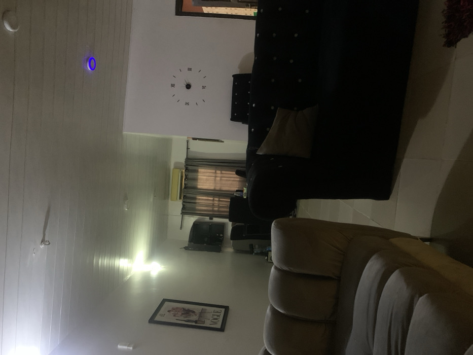 This image depicts an indoor living space located in Ogombo, Nigeria, illuminated by artificial light sources