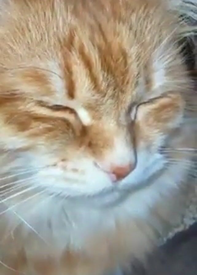 A close-up video shows a fluffy ginger cat with its eyes closed