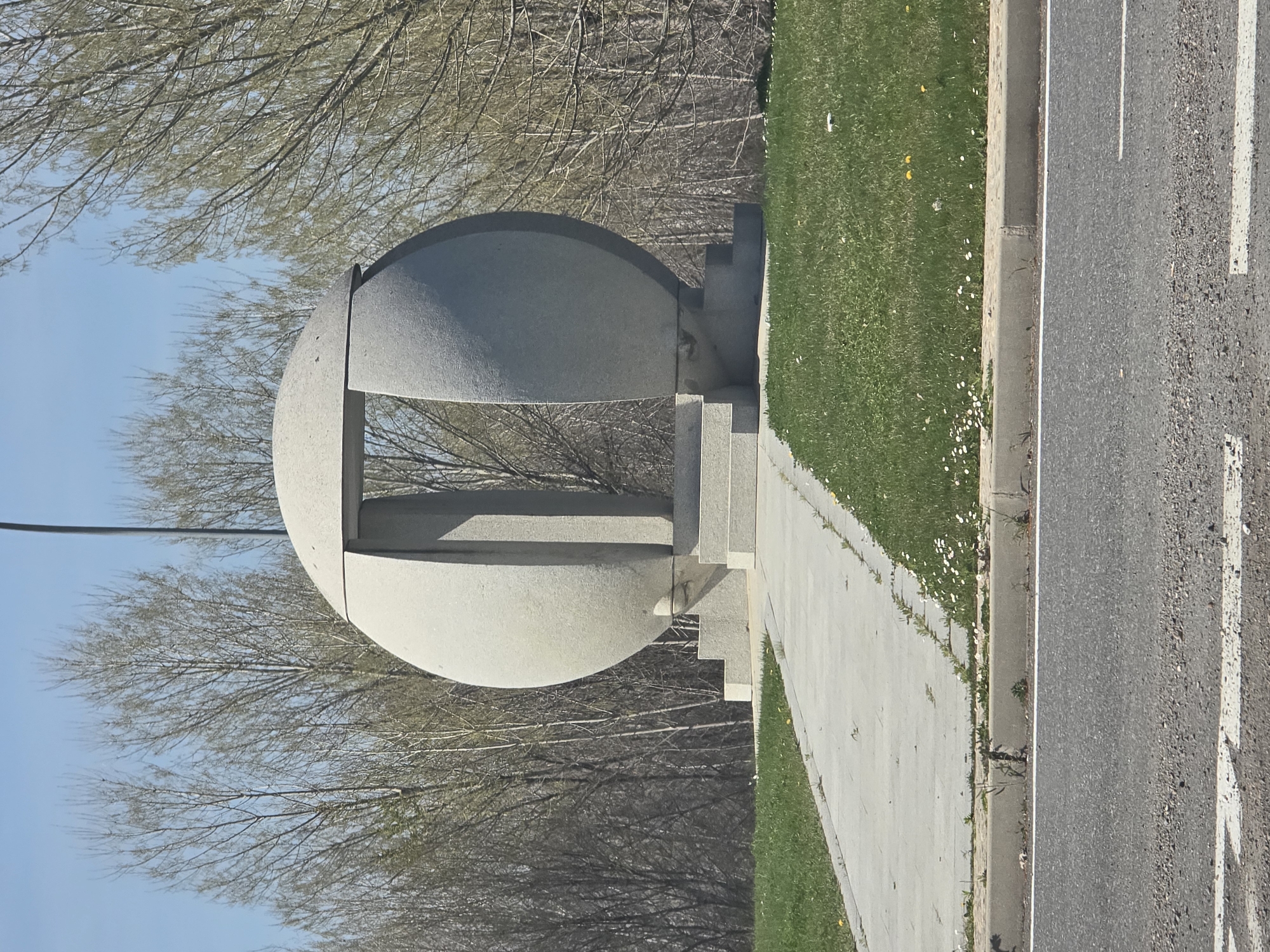 The image depicts an outdoor scene in Polígono Industrial Nicomedes García, Spain. Centrally positioned is a large, light-grey spherical sculpture, likely constructed from stone or concrete, featuring a distinct vertical, U-shaped opening or void on its front face. The sculpture rests on a multi-tiered, stepped base of matching light-grey material. A straight, light-grey paved path leads towards the base of the sculpture, flanked by strips of green grass containing scattered small white daisy-like flowers and a few yellow dandelions. In the immediate foreground, an asphalt road with a single white painted line runs horizontally, separated from the grass by a light-grey concrete curb. The background consists of a dense line of deciduous trees, mostly bare or exhibiting very sparse, light-green early spring foliage, set against a clear, light blue sky. A thin, dark vertical pole extends upwards behind the right side of the sculpture. No individuals or active subjects are present.