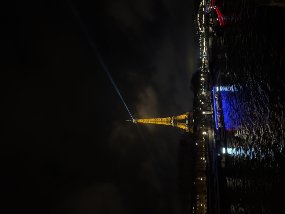 The Eiffel Tower is illuminated in golden light at night, projecting a beam upwards. The dark sky contrasts with the glowing structure. Alongside the tower, lights line the river Seine, with the water reflecting blue and white light, possibly from a boat. The city skyline is visible in the background, though mostly shrouded in darkness. The image has been rotated.