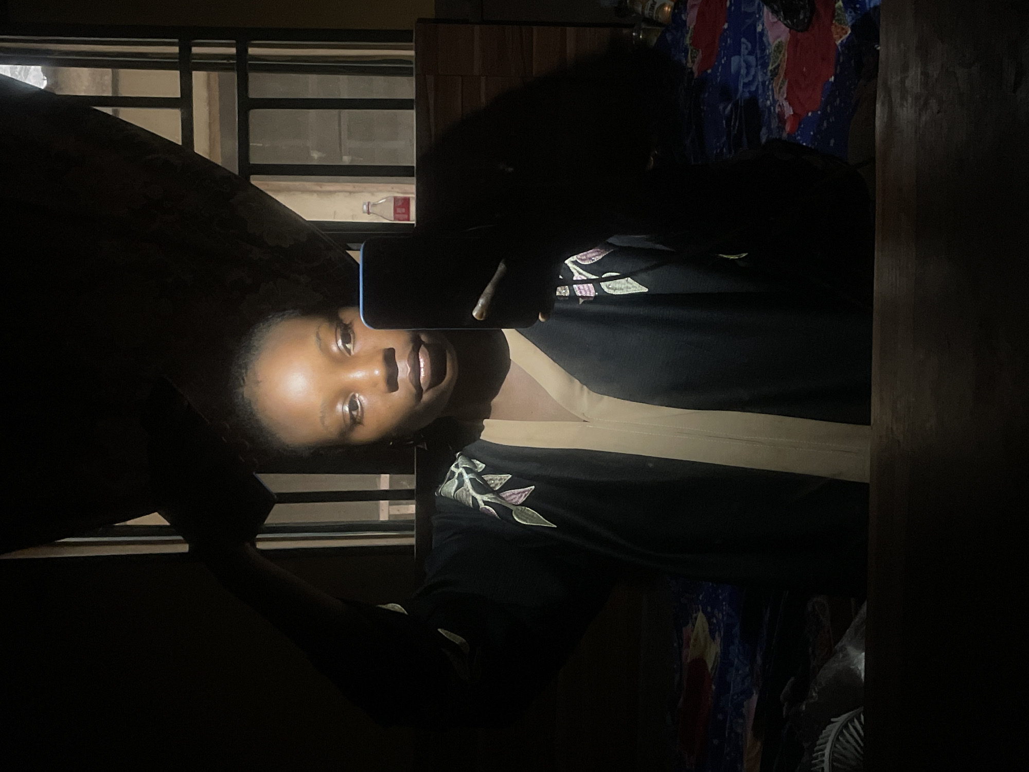 The image displays a young adult female indoors in Gwagwalada, Nigeria, taking a selfie. She is positioned centrally, partially illuminated by a strong light source from the right, which creates deep shadows across the scene. The subject has dark skin and appears to have braided hair. She is wearing a dark garment, possibly a kaftan or robe, with a light-colored inner lapel and green and pink floral embroidery on the shoulders/sleeves. Her right hand holds a dark smartphone with a light blue case, obscuring a portion of her lower face and upper torso. Behind her is a bed covered with a colorful, patterned sheet featuring blue, red, and possibly other hues. To her right, a window with dark metal security bars is visible, partially obscured by a dark, patterned curtain. A clear glass bottle with a red label is visible resting on a dark wooden surface near the window. The overall environment is dimly lit, suggesting an interior space, likely a bedroom.
