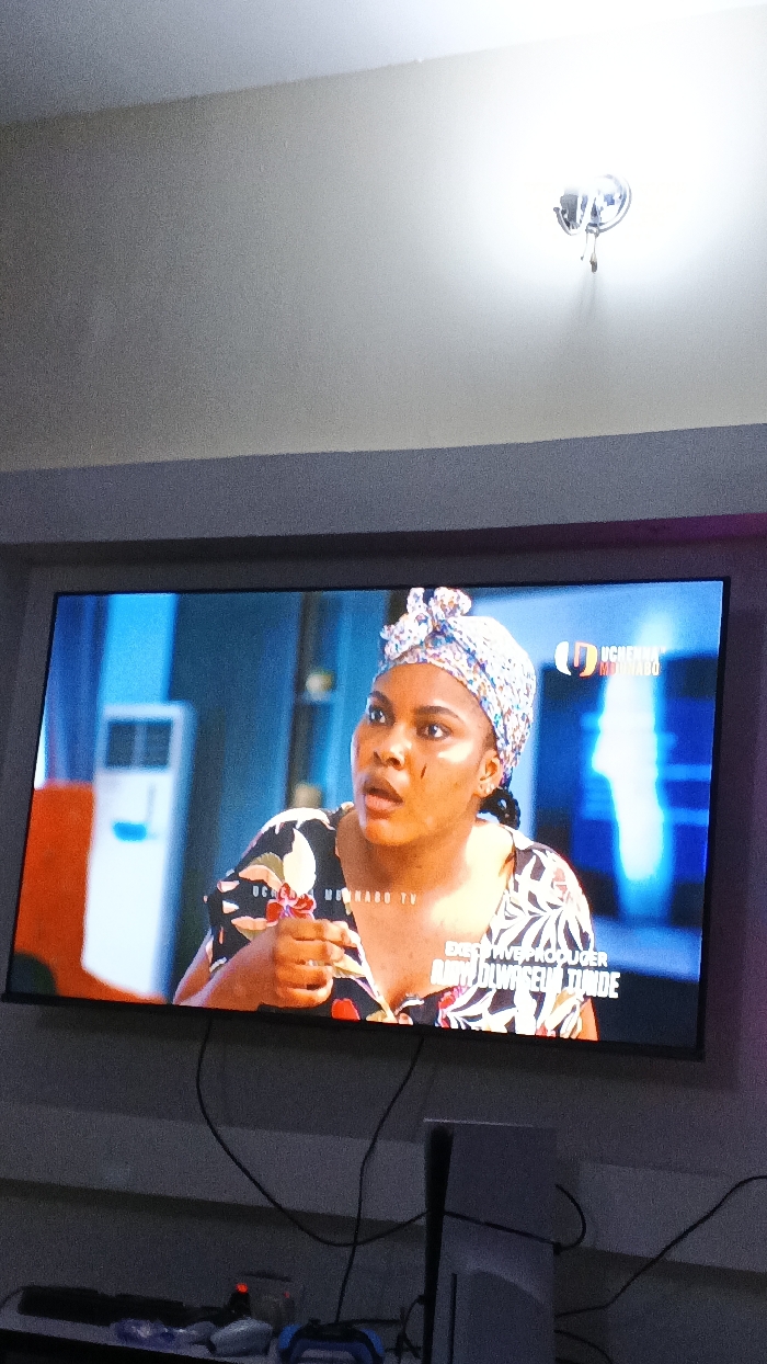 A television displays a dramatic scene with a woman wearing a head wrap and a patterned top. She has a concerned expression and a visible mark on her face. The screen also shows text related to the production, including "UcheNNI MduNwaBo" and "Executive Producer: Adeoluwaseun Tunde". Below the television, power cables and a PlayStation 5 console are visible. A light fixture is on the ceiling, creating a bright spot in the upper portion of the frame.